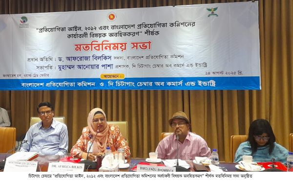 নগর প্রতিবেদক: বাংলাদেশ প্রতিযোগিতা কমিশন ও দি চিটাগাং চেম্বার অব কমার্স এন্ড ইন্ডাষ্ট্রি’র আয়োজনে “প্রতিযোগিতা আইন, ২০১২ এবং বাংলাদেশ প্রতিযোগিতা কমিশনের কার্যাবলী বিষয়ক অবহিতকরণ” শীর্ষক মতবিনিময় সভা আজ রবিবার(২৪ আগস্ট) ওয়ার্ল্ড ট্রেড সেন্টারের কনফারেন্স হলে অনুষ্ঠিত হয়। এতে সভাপতিত্ব করেন চিটাগাং চেম্বার প্রশাসক মুহাম্মদ আনোয়ার পাশা।